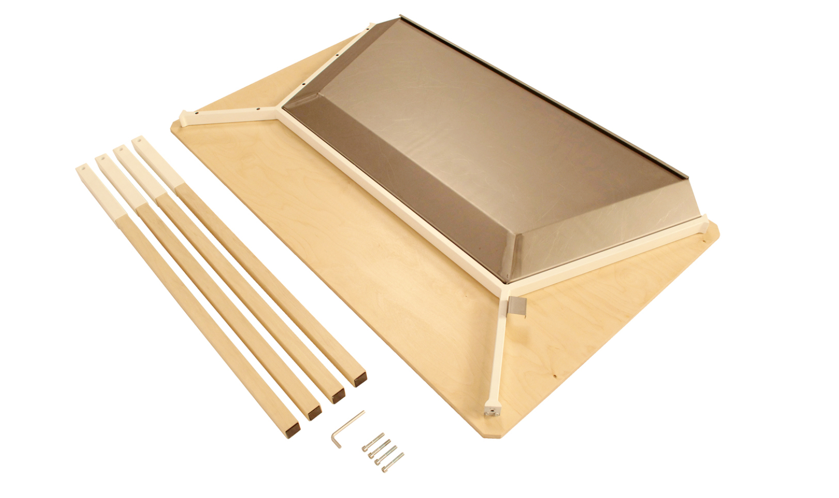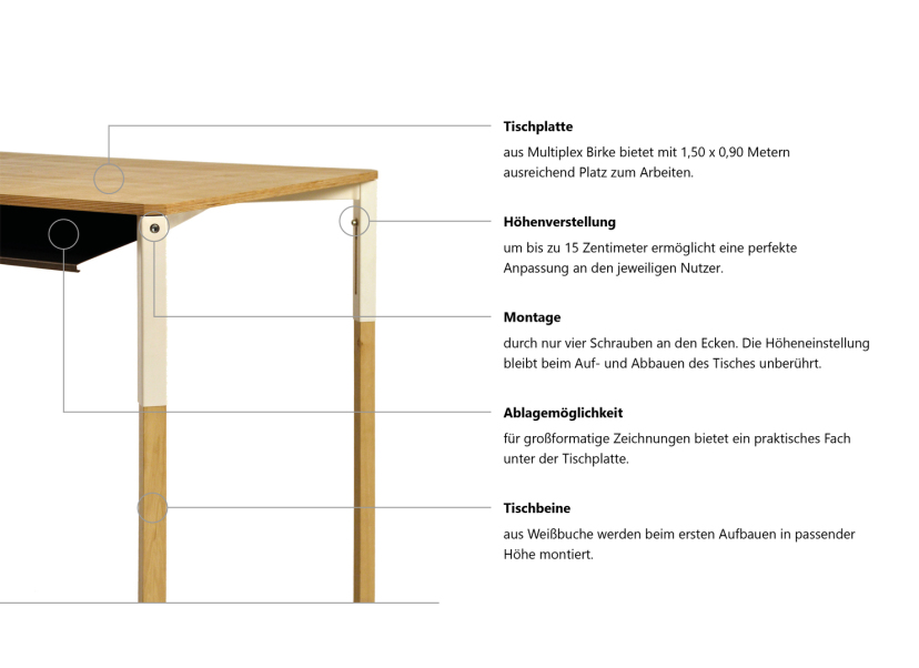Zudem ist er als Stehtisch konzipiert, an dem im Stehen oder auf einem angepassten, hohen Stuhl im Sitzen gearbeitet werden kann. Die Höhe des Tisches lässt sich auf die individuelle Körpergröße des Nutzers anpassen.