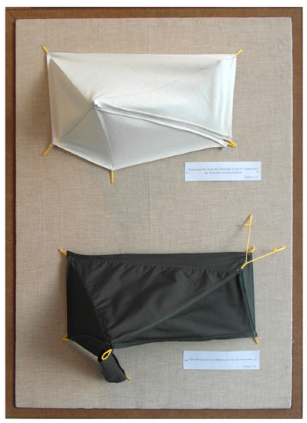 Die Designstudie verbindet drei der größten Objekte bei mehrtägigen Wanderungen im Freien zu einem neuartigen System, das durch effiziente Ausnutzung verschiedener Materialeigenschaften die drei Großen - Rucksack, Luftmatratze und Zelt - teilweise verschmelzen lässt. Ausgangspunkt der Betrachtungen ist eine umfangreiche Analyse der Thematik, aus der verschiedene Nutzerszenarien, Konzepte und die Anforderungen an das Produkt entwickelt wurden.